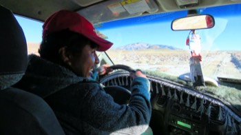 Ce jour, un grand tour est prévu pour le Salar de Coipasa, ce lac salé que nous apercevons au loin. Pedro nous accompagne.