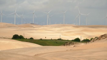 Et … des dunes vers la plage de Pedra Rachada et la vision d’éoliennes, très présentes dans cet état du Brésil, le Ceará.