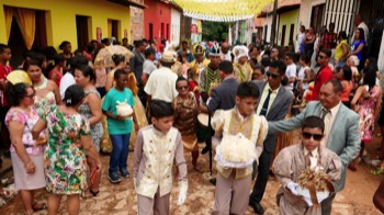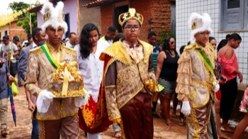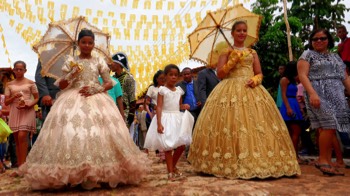 On nous invite à rentrer dans l’une d’elles, à photographier. Une histoire d’empereur choisissant son impératrice en passant dans sept maisons… L’explication en portugais n’est pas simple… Bref, un cortège arrive avec des jeunes filles et garçons aux costumes de théâtre, mais pour eux ce n’en est pas, il y a un côté religieux qui nous échappe. Ils entrent, dansent, chantent…