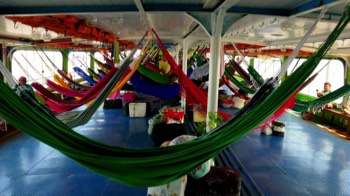 Chargement de caisses de fruits, ananas, melons, oranges… avant les passagers qui, petit à petit, vont investir la grande salle climatisée réservée aux hamacs.