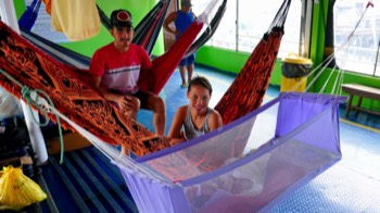Au pont supérieur, salle de hamacs à l’air libre puis encore au-dessus terrasse avec tables et chaises. Trois étrangers seulement sur ce bateau, un Italien et nous deux. Uniquement des Brésiliens, beaucoup en famille. Des bébés inaugurent des hamacs à leur taille…