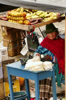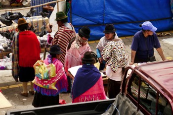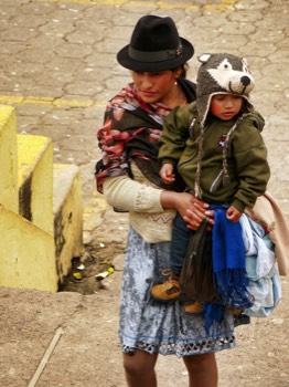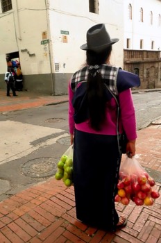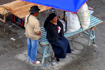 Une boutique à l’angle, la nuit tombe et tous les deux, entrant sacs dans le dos, demandons à cette commerçante si je peux attendre là. Un instant de surprise aperçu dans ses yeux et elle me passe une chaise. Elle, pas n’importe qui, mais une femme élégante habillée de façon traditionnelle tout comme son mari. Ils ont en commun une longue natte dans le dos. Voilà nos premiers Kichwas.