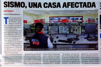 Les escaliers… je le suis ma salade dans les mains, et nous retrouvons Edwin, le réceptionniste, prêt à sortir. Lui-aussi a ressenti ce tremblement. D'une puissance moyenne de 4,2 sur l’échelle de Richter, nous avons clairement ressenti ce tremblement de terre car son épicentre était situé à seulement 18 km du centre de Quito.