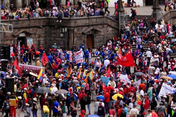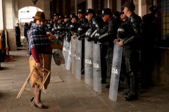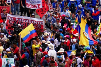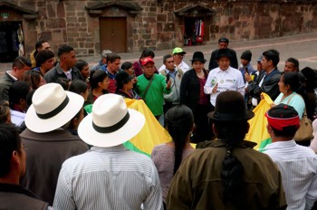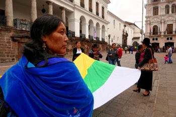 Une délégation de la province amazonienne Zamora-Chinchipe attend davantage de reconnaissance de la part du gouvernement et le fait savoir avec ce drapeau sagement maintenu. Cette province, avec pour capitale Zamora, est la plus au sud de l’Équateur.