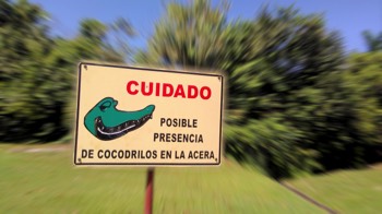 S’il manque un passager dans le Queen Elisabeth, c’est que, lors d’une escale, il n’a pas lu le panneau ci-dessous. Et oui, des crocos sur le trottoir !!!