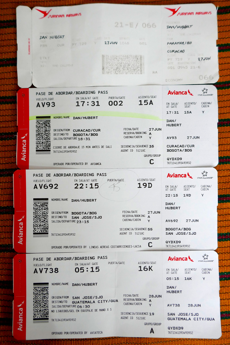 Un clin d’oeil sur nos quatre tickets d’embarquement entre le Surinam et le Guatemala :