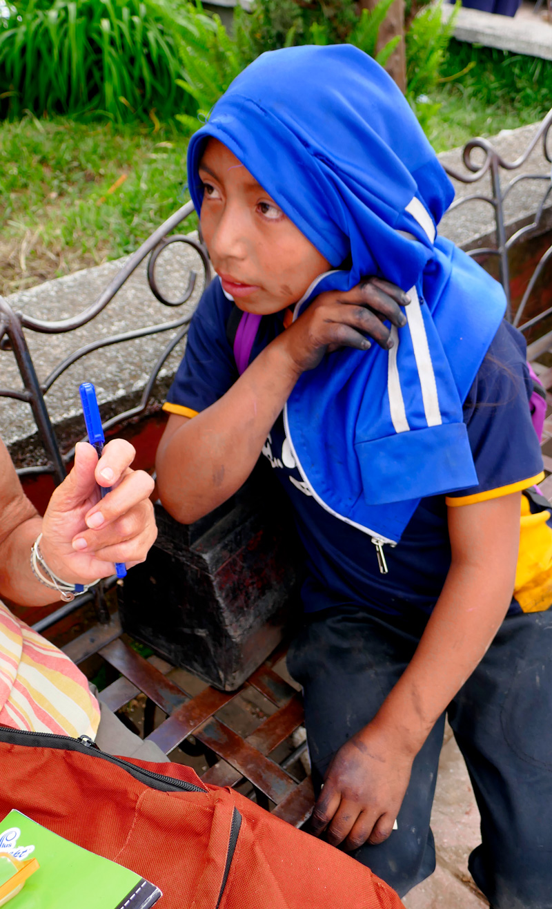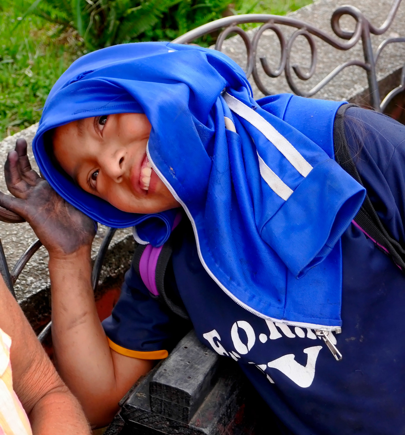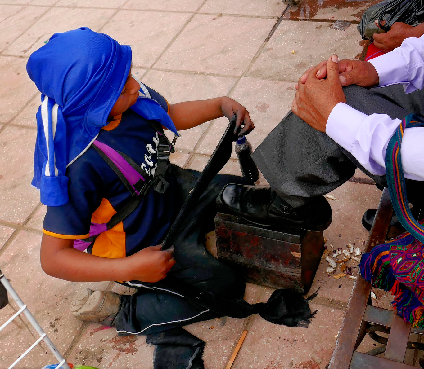 Rencontre aussi avec Catarina, 11 ans, seule fille faisant ce boulot. Elle porte une veste de jogging bleue sur la tête pour cacher ses cheveux longs. Elle me dit avoir été à l’école à l’âge de 7 ans pendant deux ans seulement. Elle lit pourtant bien et plus vite que les cireurs garçons. Elle est alerte, vive, pleine d’intelligence…